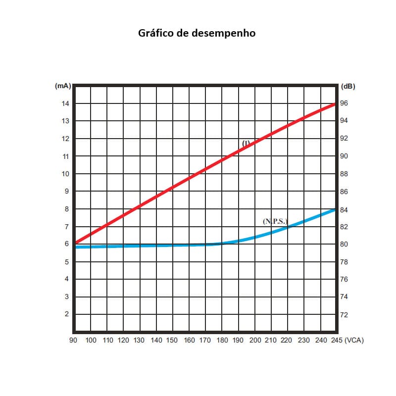 Emite 80 Decibéis a 1 metro de distância com tensão a 170VCA, com pressão máxima de 96 dB a 245VCA.
