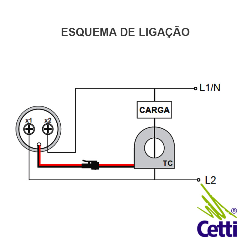 Possui 2 contatos por parafuso: x1 e x2 e cabos com conexão de engate rápido para o mini transformador de corrente (TC).