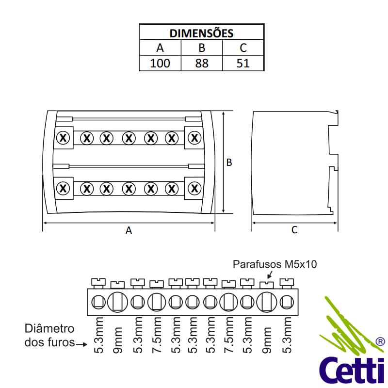 Contem 4 barramentos com 11 vias cada. Veja diâmetro das vias nas imagens do produto.