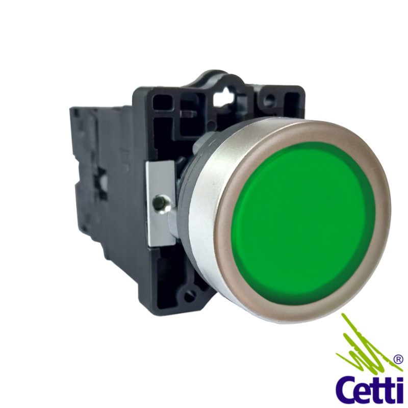 É do tipo botão iluminado de pulso (ou impulso) sem trava ou botoeira iluminada sem retenção. Normalmente usado para ligar, dar arranque, ignição e partida em máquinas e equipamentos.