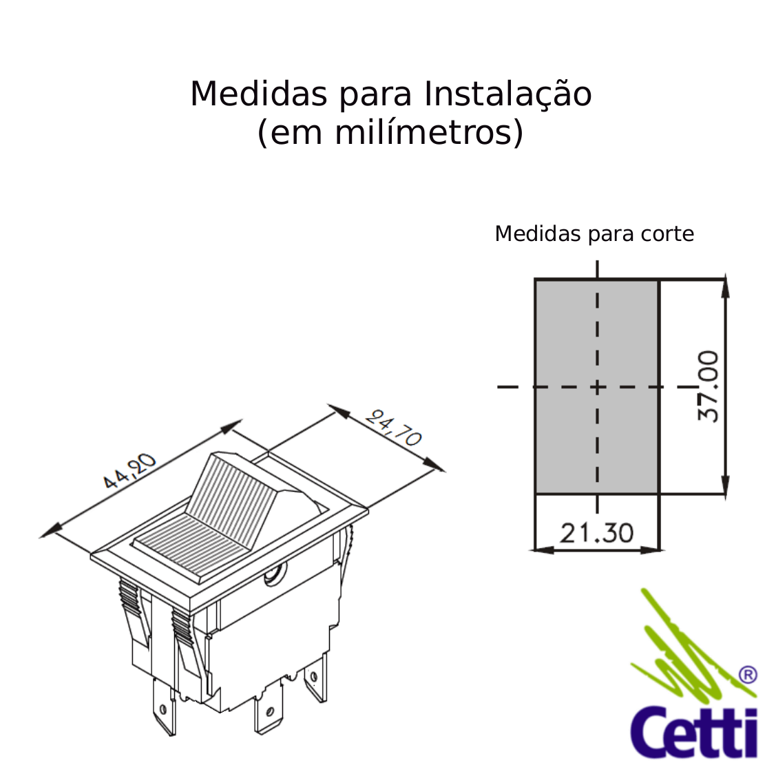 O corte para instalação deve ter 37 mm por 21,3 mm.