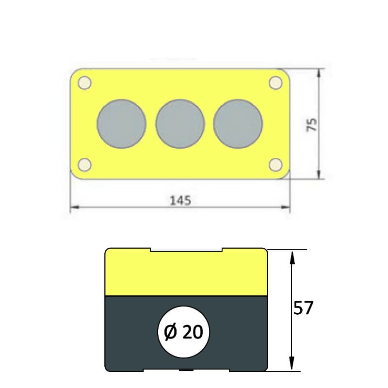 Caixa para montagem de 3 botões de comando, chaves seletoras, sinaleiros ou alarmes sonoros.