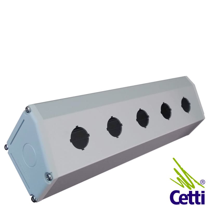 Caixa para montagem de 5 botões de comando, chaves seletoras, sinaleiros ou alarmes sonoros.