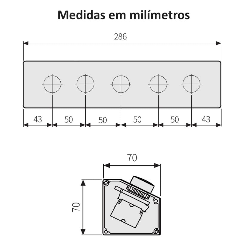 INDICAÇÃO DE USO: para acomodar 5 dispositivos de comando elétrico com montagem em 22 mm de diâmetro cada.