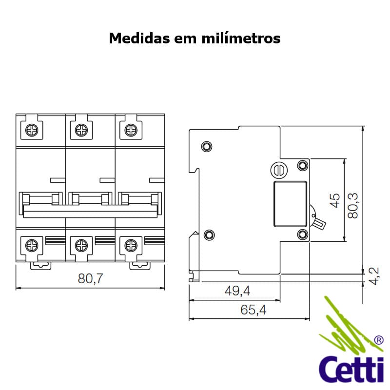 O disjuntor mede 80,7 mm de largura, 80,3 mm de altura e 65,4 mm de profundidade (sem a manopla). O peso líquido é de 630 gramas.