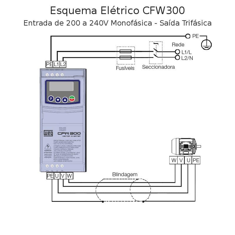 Inversor de frequência CFW300 da WEG. Para entrada a 220V monofásica, com saída trifásica.