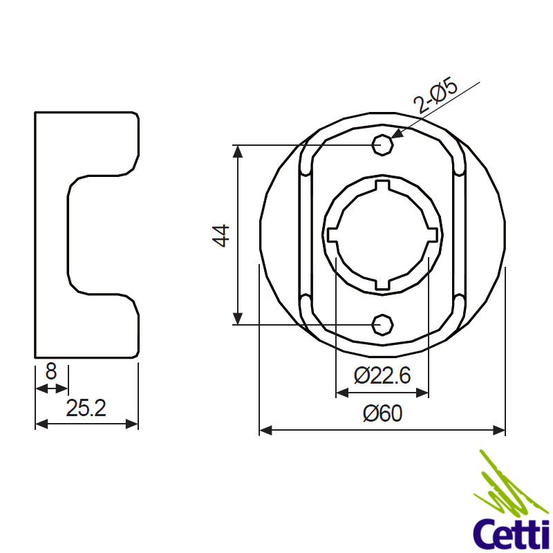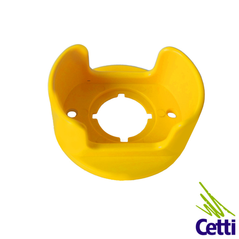Feito em plástico rígido e resistente na cor amarela, possui 60 mm de diâmetro externo e 25,2 mm de altura. É compatível com botão de 22 mm, o diâmetro interno tem 22,5 mm e a furação dos parafusos tem 2 mm de diâmetro cada, com distância de 44 mm entre elas.