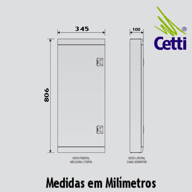 O quadro de distribuição é feito em termoplástico e aço carbono, possui pré cortes para passagem de conduítes, placa de montagem com fixação rápida, amplo espaço para entrada de cabos, porta de fácil montagem/ remoção com abertura em 180 graus e opção de chave de segurança (não inclusa) para ser trancada. O índice de proteção é IP40.