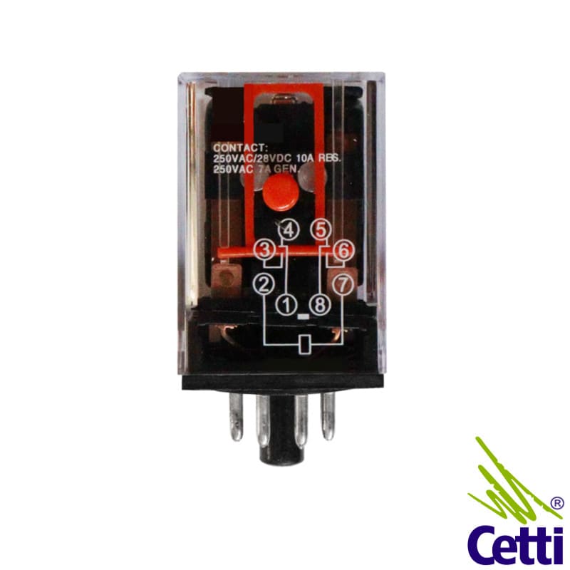 Com 8 pinos dispostos em formato circular para acoplamento na base para relé.