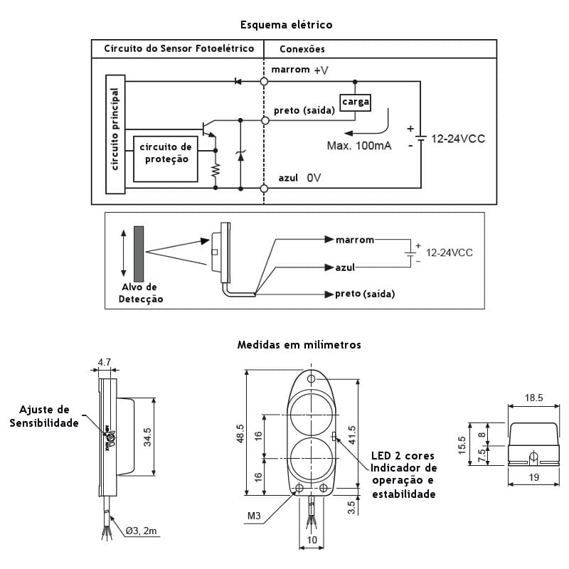 Pode ser aplicado para detectar distância, movimento, presença ou ausência de objetos, por meio de transmissor e receptor de luz, com detecção difuso reflexiva