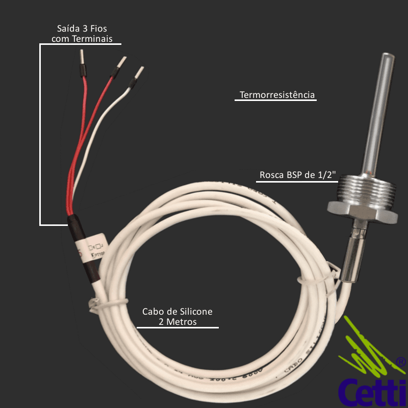 A termorresistência mede 50 mm de comprimento por 6 mm de diâmetro, a rosca com passo BSP é de meia polegada, o cabo de silicone mede 2 metros de comprimento e na sua ponta, os 3 fios de saída, com terminais pré-isolados para conexão no controlador/ medidor de temperatura.