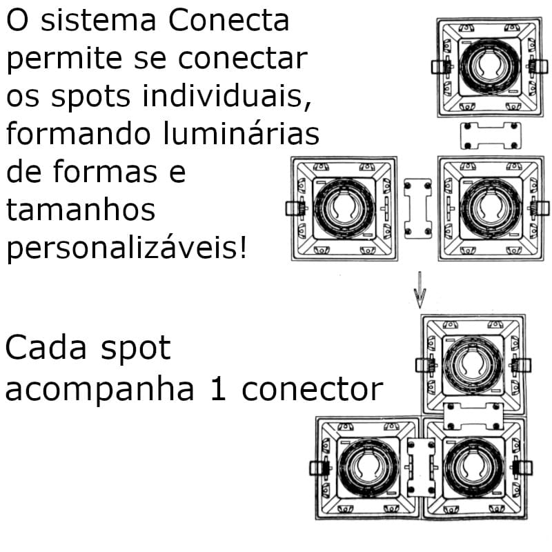 Possui sistema Conecta, que permite a montagem de mais de um spot em conjunto, possibilitando uma maior flexibilidade em sua instalação (veja imagens).