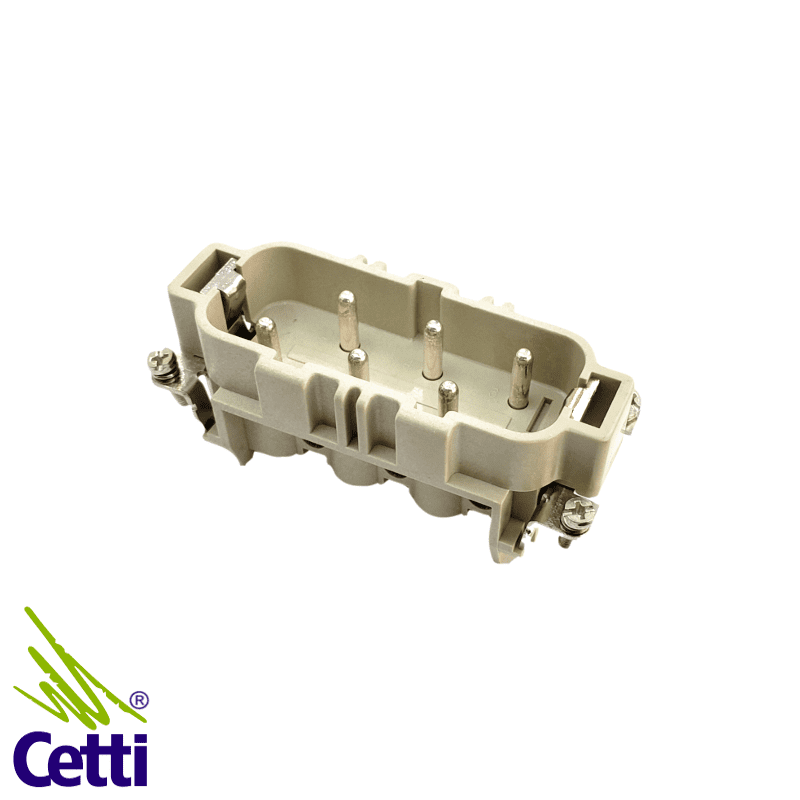 Conector múltiplo para montagem de tomada multipolar macho de uso industrial em máquinas e quadros elétricos. Feito em plástico de engenharia reforçado com grande poder de isolação, os contatos são em latão prateado. Possui 6 polos e a capacidade dos contatos é de até 35 Àmperes e 500 Volts.